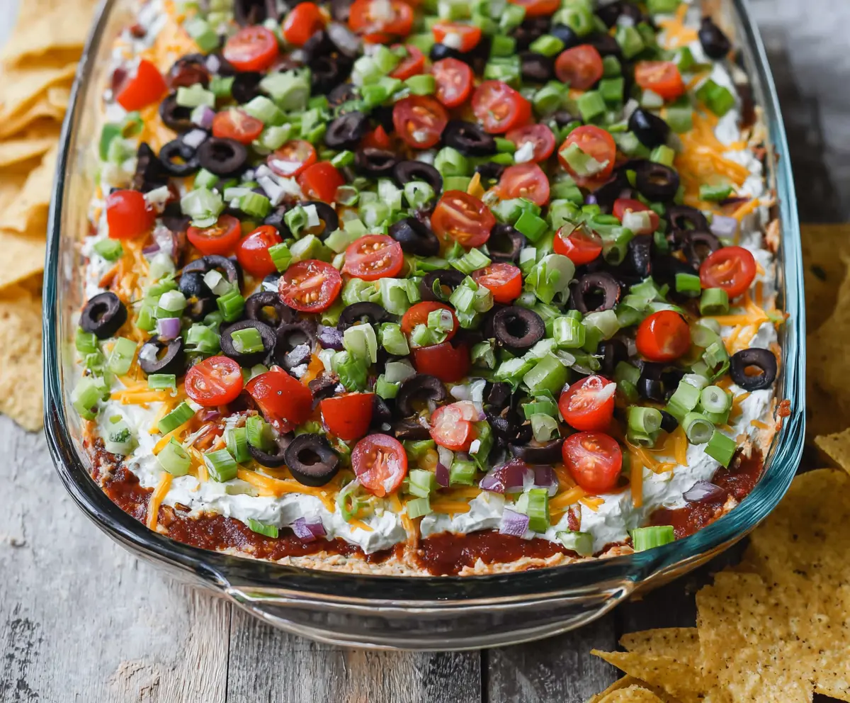 Now, it’s time for the fun toppings! Scatter sliced black olives, halved cherry tomatoes, and chopped green onions over the guacamole layer. Make it look colorful and inviting!