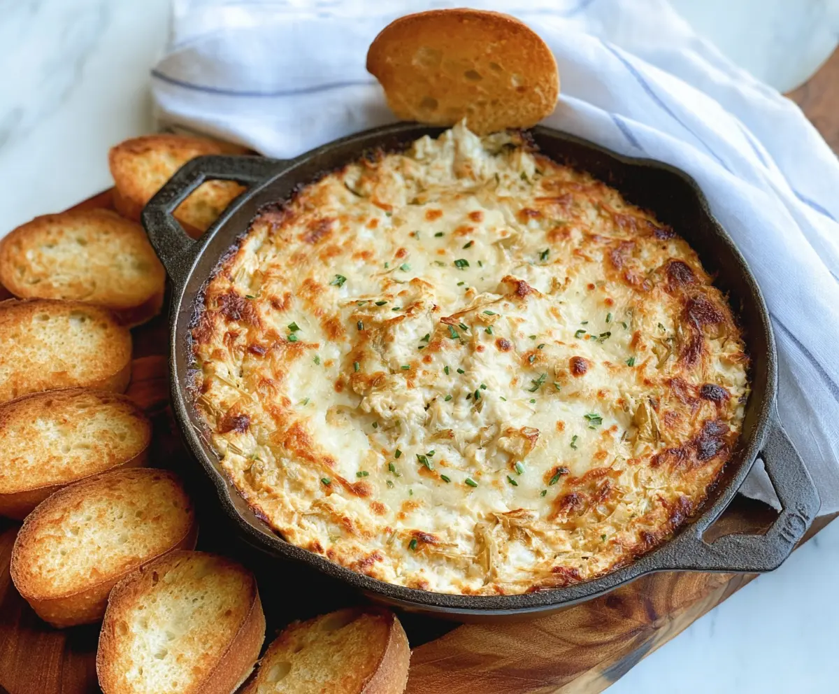 Once it’s out of the oven, garnish with fresh thyme and chopped green onions if desired. Serve it while hot with tasty toasted baguette slices, crispy crackers, or fresh bread on the side for dipping.