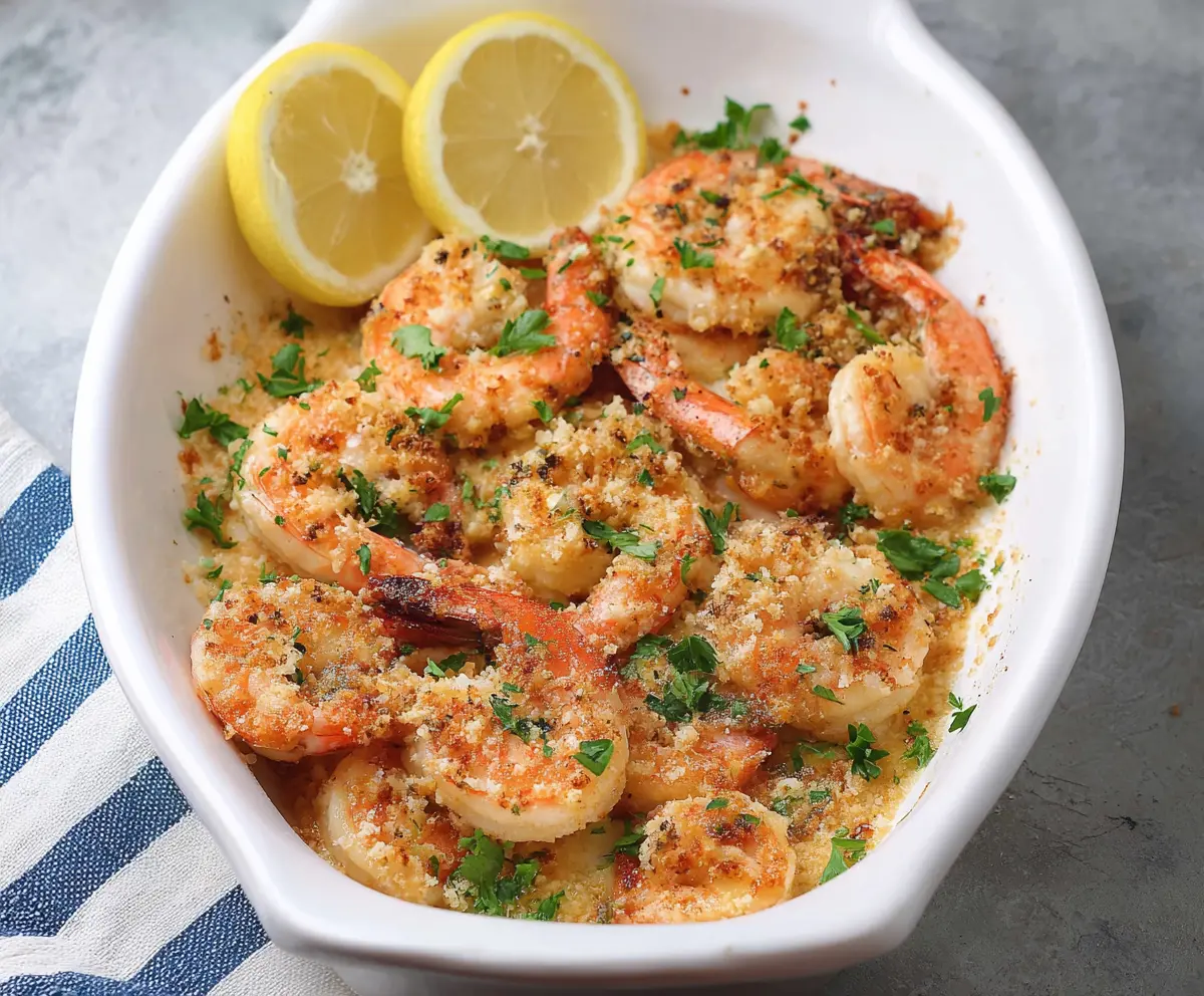 Place the baking dish in the preheated oven and bake for about 10-12 minutes. Keep an eye on them until the shrimp are pink and opaque and the topping is golden and crispy, which is when they’ll be perfect!