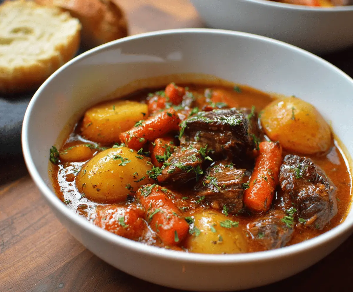 Hearty beef stew with tender carrots and potatoes in a savory broth, perfect for comforting meals.