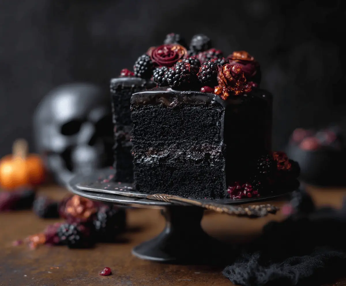 Top the cake with fresh blackberries and sprinkle dried edible dark purple flowers or rose petals for a touch of Halloween elegance. If you’re feeling extra festive, dust with edible black glitter for that spooky shimmer!