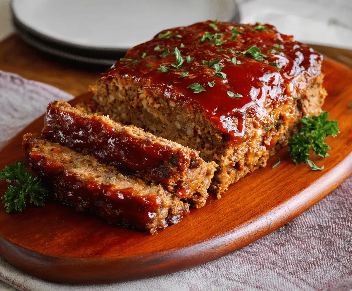 Delicious meatloaf glazed with brown sugar and ketchup, garnished with fresh herbs, on a rustic wooden plate
