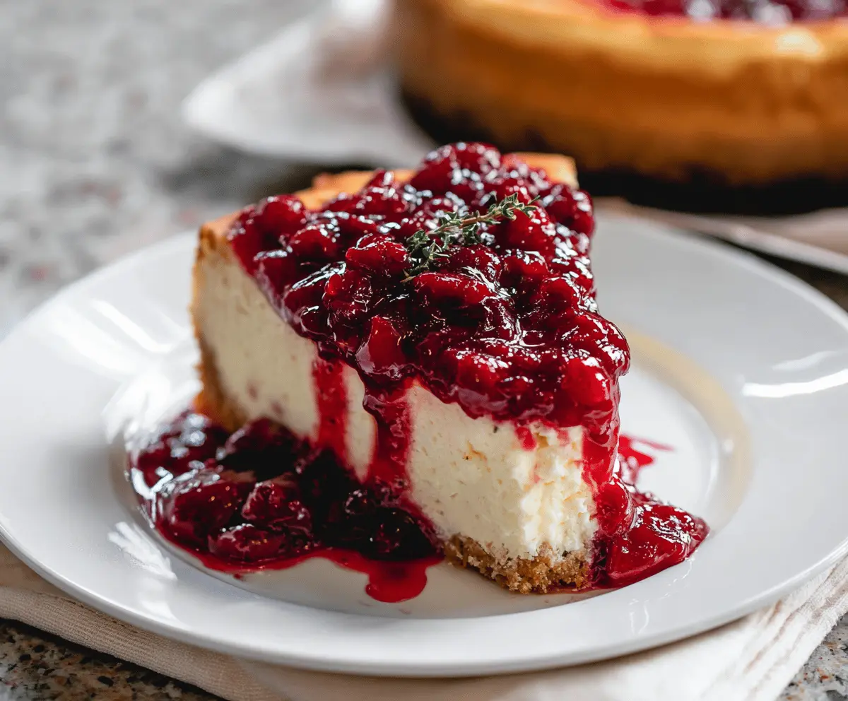 This cheesecake is creamy and dreamy, topped with a bright and tangy cranberry sauce. The flavors blend so well, making each bite refreshing and tasty!