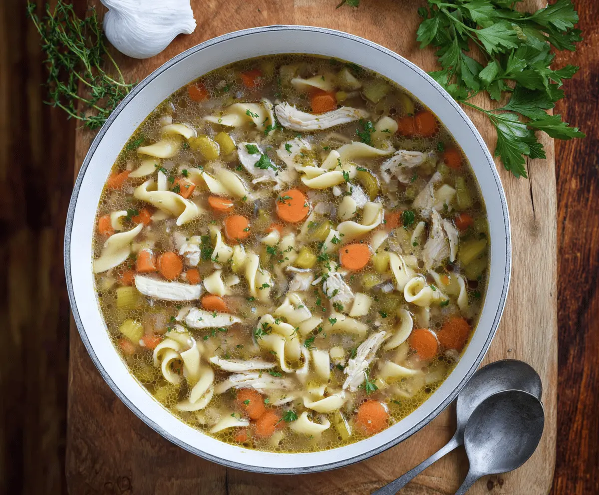 This warm chicken noodle soup is packed with tender chicken, tasty noodles, and colorful veggies like carrots and celery. It’s like a big hug in a bowl!