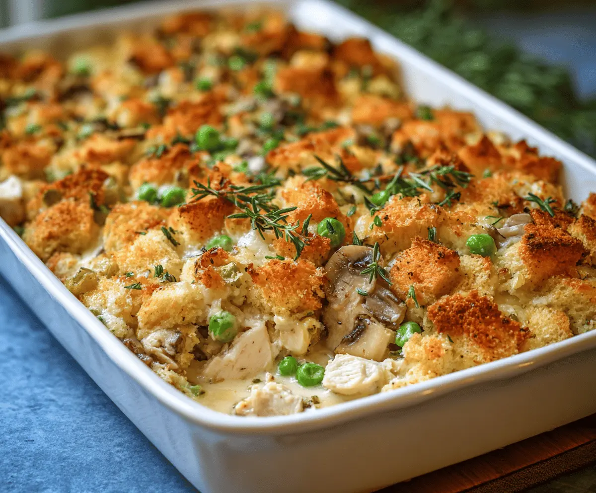 Before serving, sprinkle some chopped fresh parsley on top for a pop of color and freshness. Now, dig in and enjoy your cozy and hearty Chicken & Stuffing Casserole!