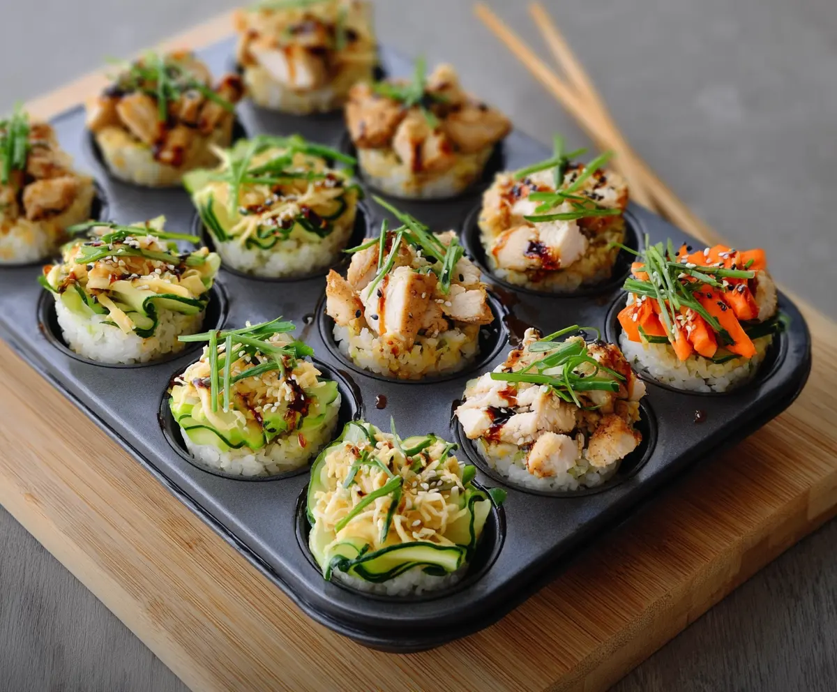 Once they’re out of the oven, you can optionally drizzle a little wasabi mayo or spicy mayo for an extra kick. Carefully lift each sushi cup from the tin and serve warm or at room temperature. Enjoy these delightful Chicken Sushi Cups as a fun, hand-held sushi-inspired appetizer or light meal!