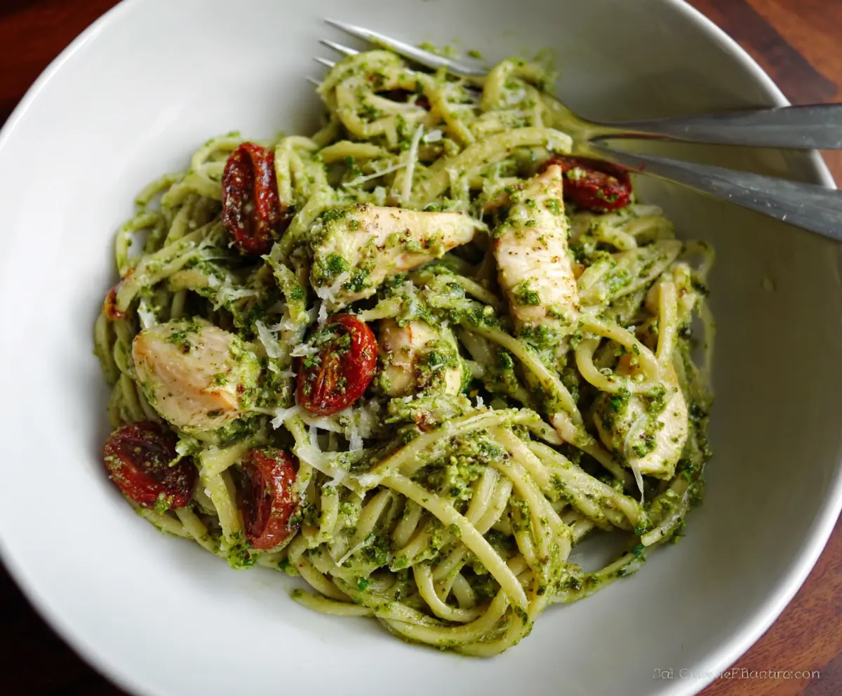 This recipe beautifully blends the fresh herbal notes of cilantro with classic pesto richness, juicy chicken pieces, and sweet sun-dried tomatoes. It’s sure to be a hit!