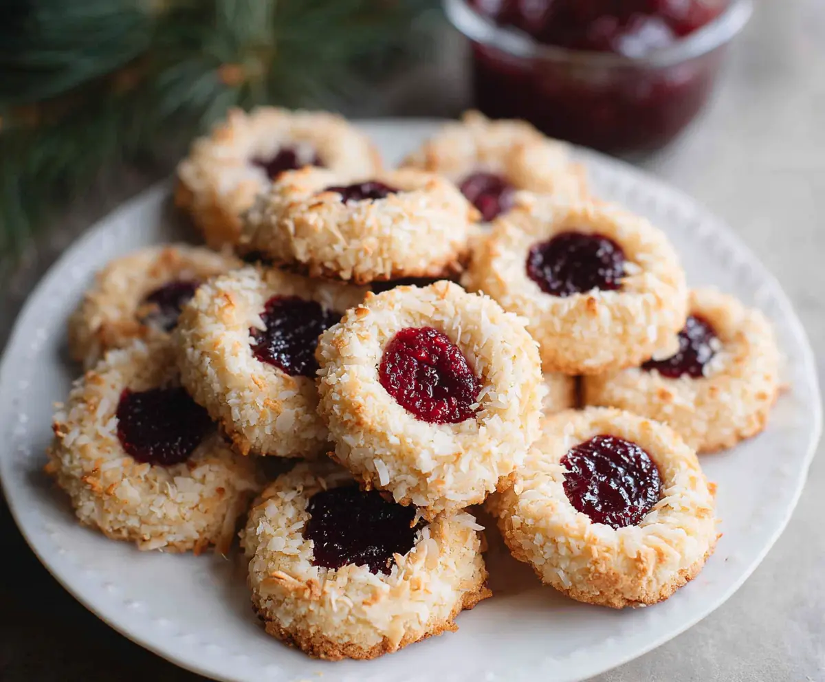 Enjoy these chewy, coconutty thumbprint cookies filled with sweet raspberry goodness! Perfect for a snack or dessert. 😊