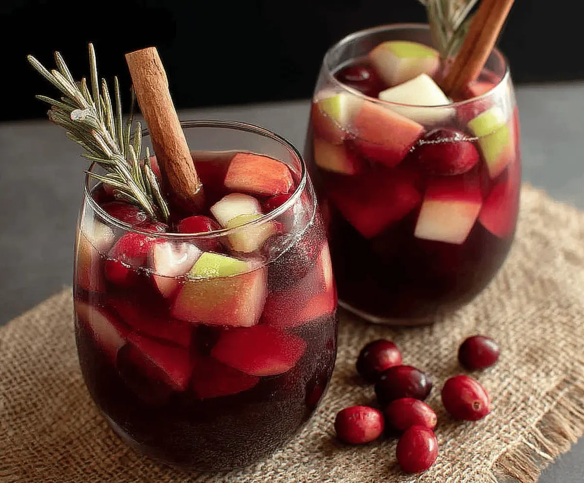 Carefully pour the sangria into glasses, ensuring each glass gets some apple and cranberries. To finish, garnish each drink with a sprig of fresh rosemary for a touch of elegance and aroma.