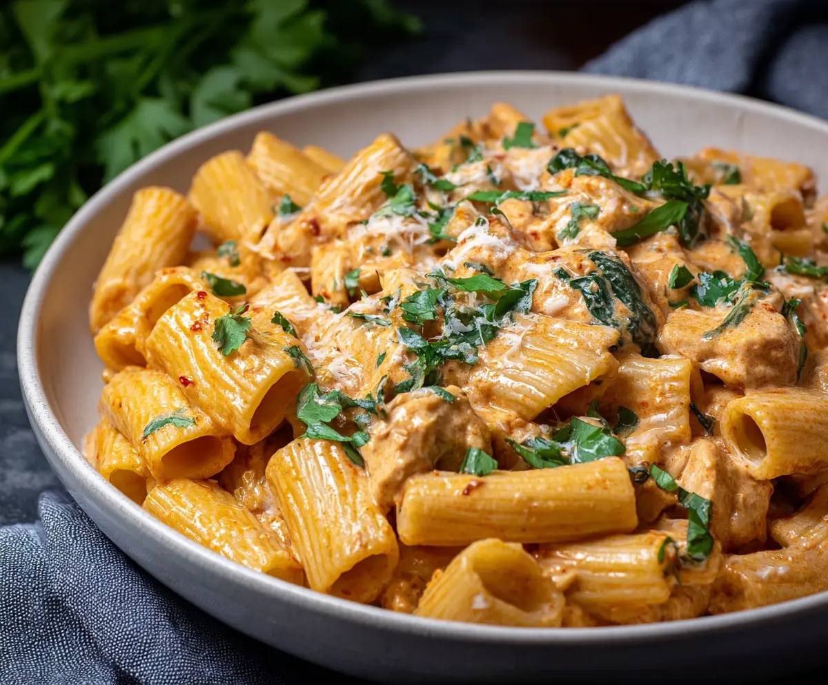 Dish out the creamy chicken rigatoni onto plates, and garnish with freshly chopped parsley for a pop of color. Enjoy your delicious meal!