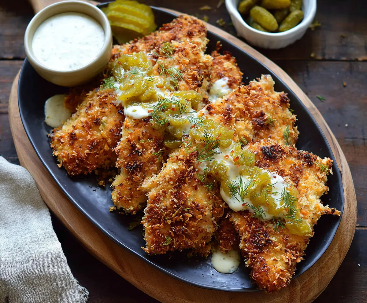 Arrange the crispy chicken breasts on a serving platter. Drizzle the dill pickle Parmesan sauce generously over the chicken to make it extra delicious!