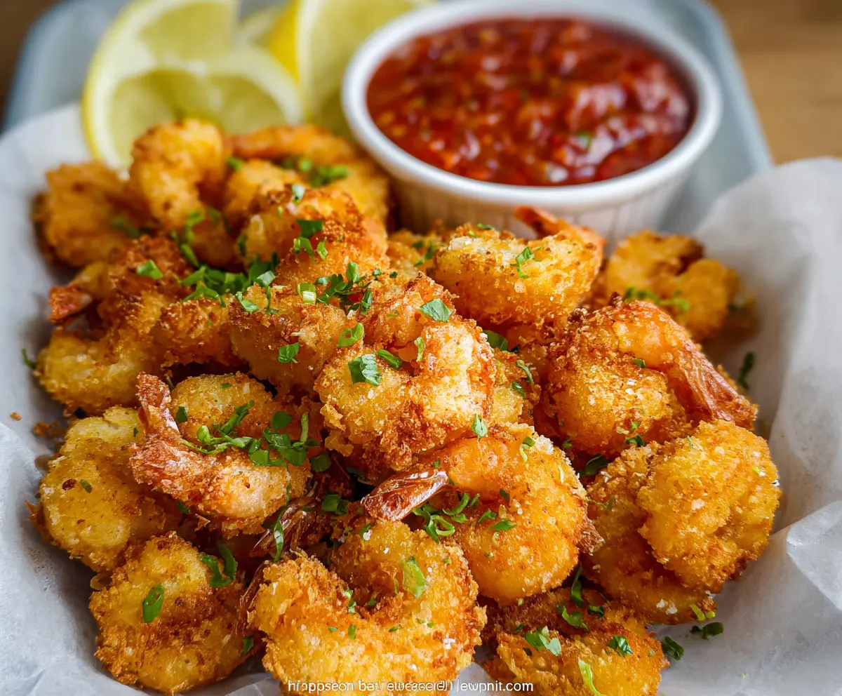 Garnish the crispy popcorn shrimp with chopped parsley, and serve them right away with lemon wedges and your favorite dipping sauce, like cocktail sauce. Enjoy your crunchy, flavorful treat!