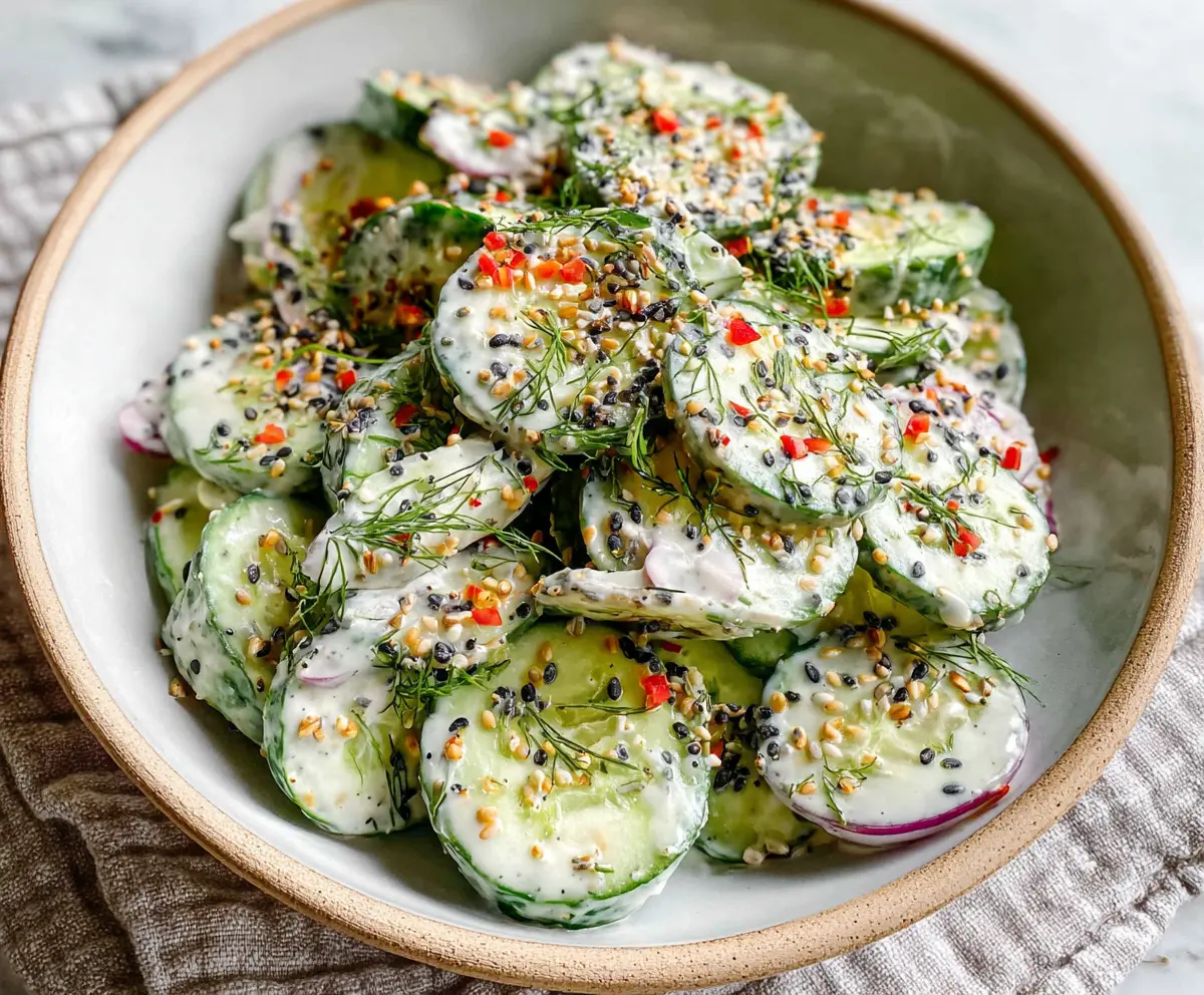 This Cucumber Everything Bagel Salad is a fresh, crisp delight! With cool cucumbers, creamy dressing, and a sprinkle of everything bagel seasoning, it’s a tasty twist on salad time.