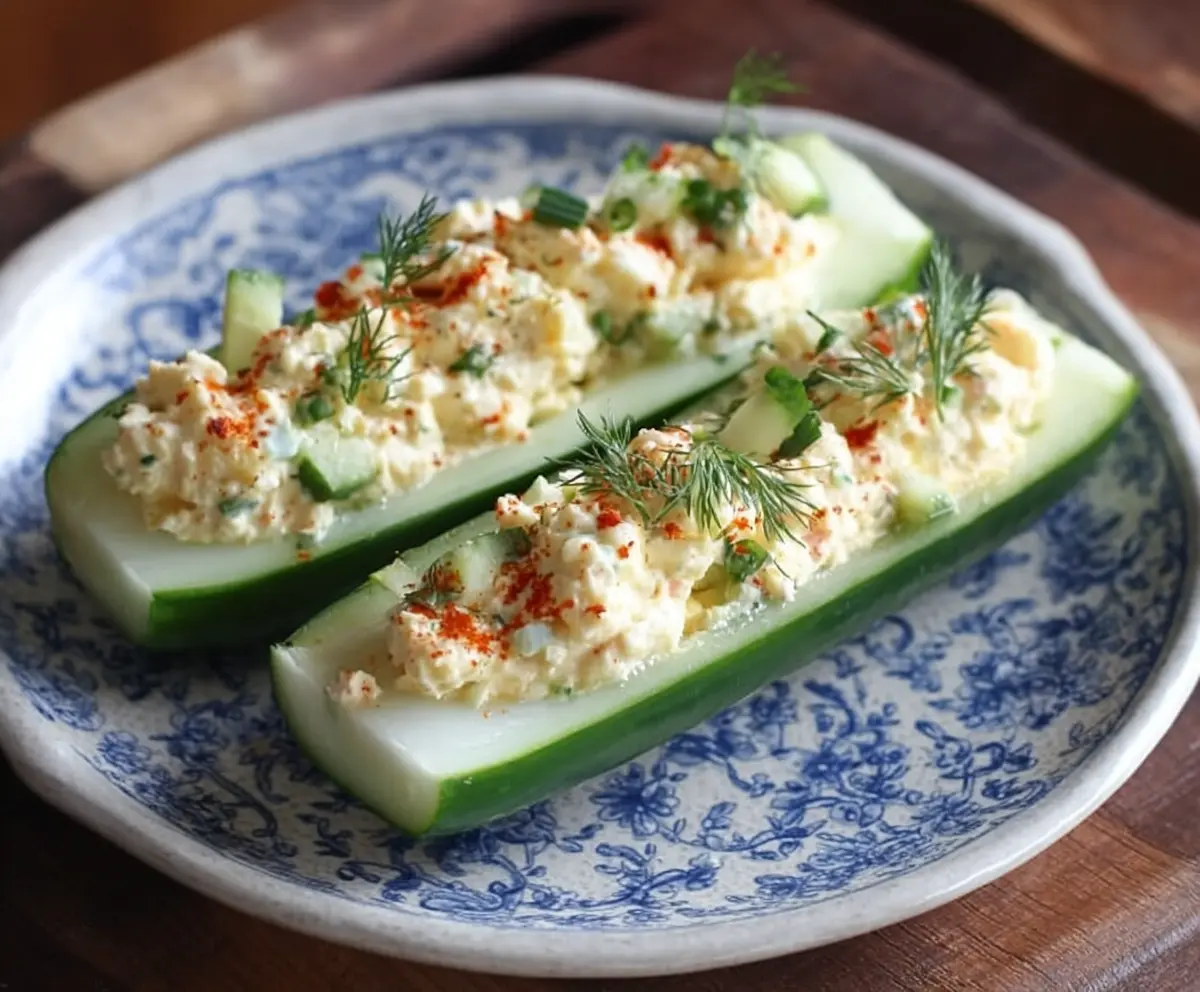 Egg Salad Stuffed Cucumbers are a tasty and refreshing treat! This dish features creamy egg salad nestled in crunchy cucumber boats, making them fun to eat.