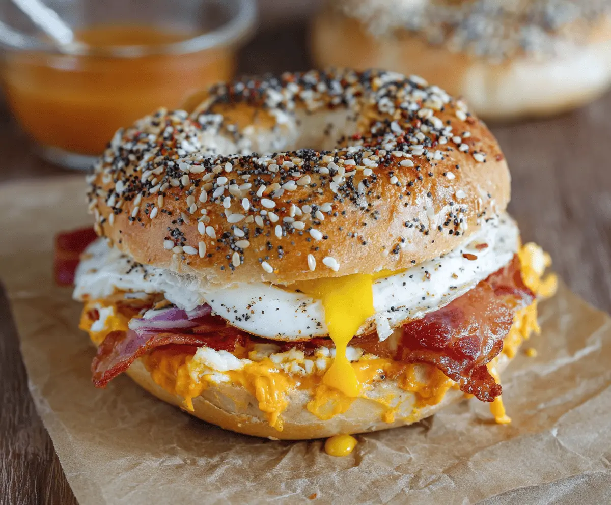 This Everything Bagel Breakfast Sandwich is a tasty start to your day! It’s filled with creamy eggs, crispy bacon or sausage, and topped with cheese—all packed into a warm, everything bagel.