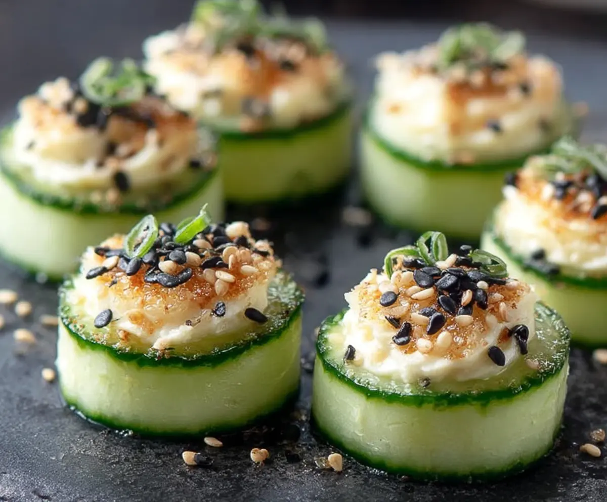 If you want to add a pop of color and freshness, garnish each cucumber bite with a small sprig of fresh herb, like thyme or dill. These add a lovely touch and enhance the flavor.