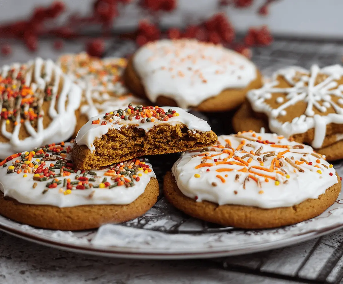 Delicious frosted gingerbread cookies decorated with white icing and festive sprinkles.
