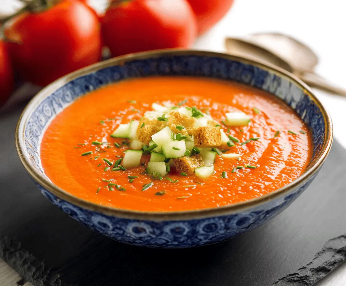 Now you have a lovely bowl of gazpacho with a bright red base, topped with crunchy garnishes. It’s not just beautiful—it’s bursting with flavors that will keep you coming back for more!
