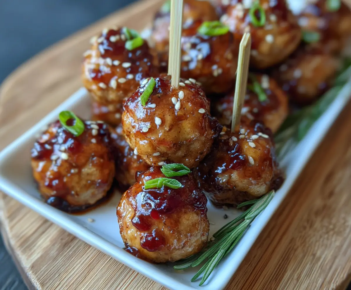 Arrange your delicious, glazed meatballs on a serving platter. For a beautiful touch, sprinkle with toasted sesame seeds and extra sliced green onions.