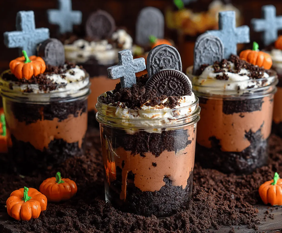 This dessert features layers of chocolate and vanilla pudding with crushed Oreo cookies that look like dirt, topped with whipped cream and festive graveyard-themed decorations. Perfect for Halloween parties or any fun occasion!