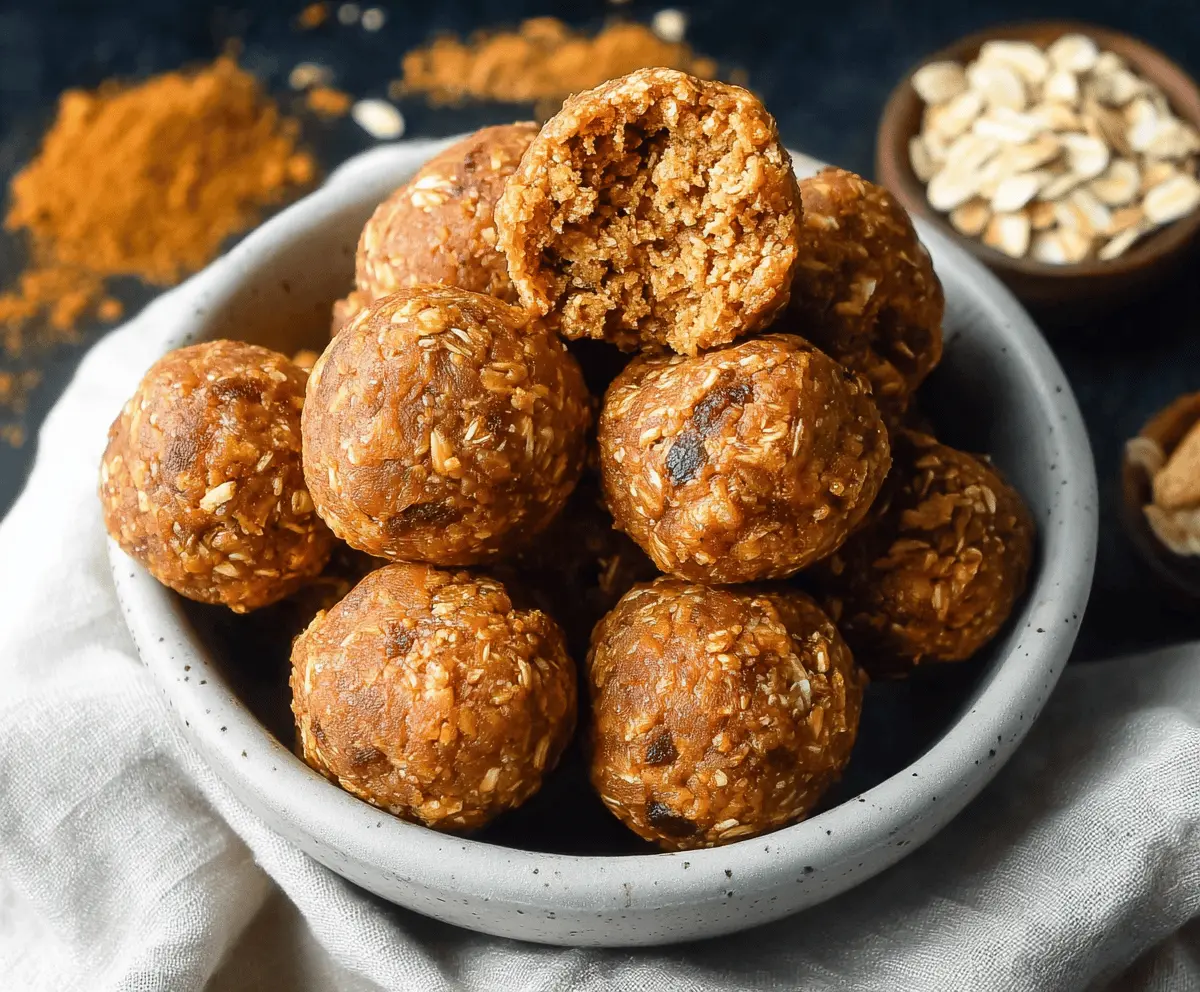 Delicious healthy pumpkin spice protein balls on a white plate, featuring a fall-inspired treat with pumpkin, cinnamon, and protein powder for a nutritious snack