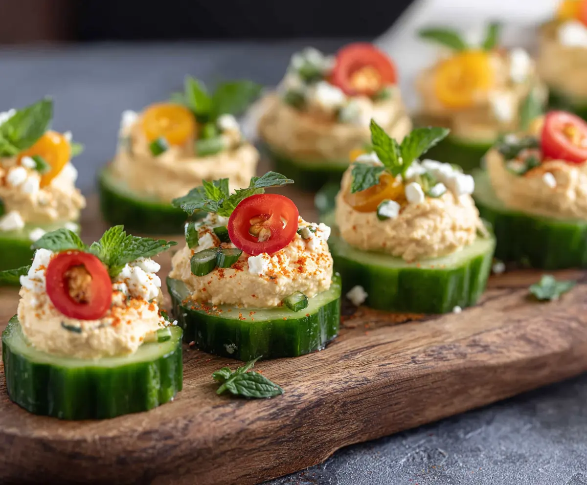 Hummus Cucumber Bites are a crunchy and tasty snack. They use fresh cucumber slices topped with creamy hummus, making them refreshing and healthy.