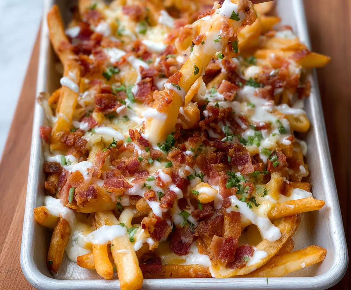 Once the cheese is melted, remove the fries from the oven. Drizzle ranch dressing over the cheesy goodness, and scatter the crispy bacon pieces on top.