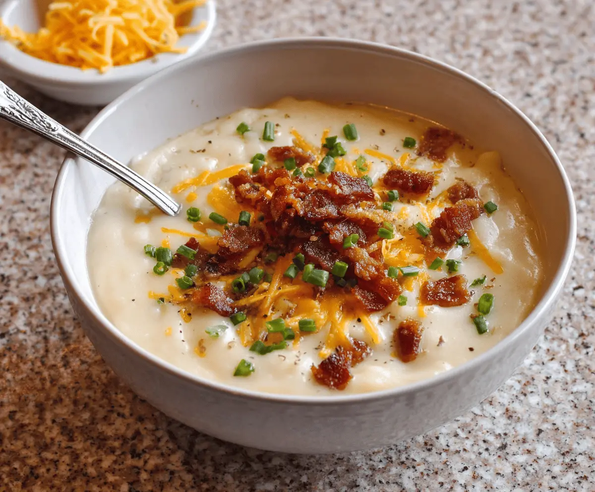 Creamy loaded potato soup topped with crispy bacon and shredded cheese in a bowl, garnished with chopped green onions