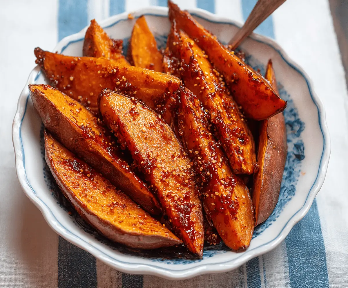 Sweet potato wedges glazed with maple syrup and chili, seasoned and baked to perfection, ready to serve as a flavorful, spicy snack or side dish.