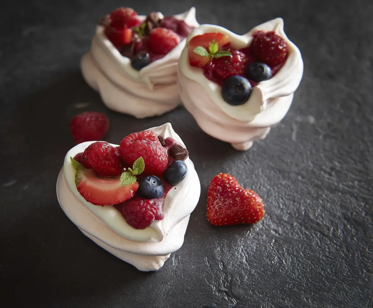 Your exquisite Mini Heart Pavlovas are now ready! Serve immediately to enjoy the perfect texture and freshness. Happy indulging!