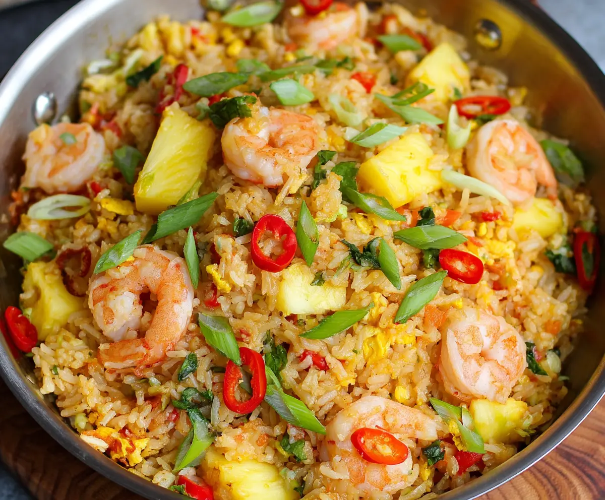 This Pineapple Shrimp Fried Rice is a colorful and tasty dish! With juicy shrimp, sweet pineapple, and fluffy rice, it’s like a party in a bowl.