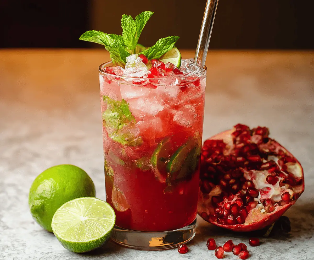Refreshing Pomegranate Mojito cocktail garnished with fresh mint leaves and pomegranate seeds