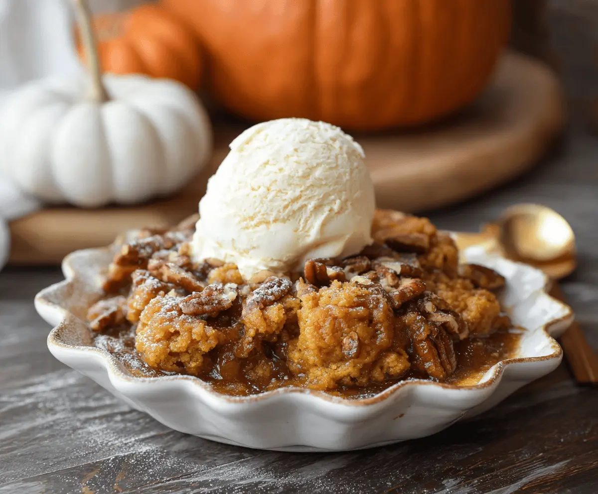 Once baked, remove your pumpkin cobbler from the oven and let it cool slightly. This will make it easier to cut into portions. Serve it warm with a big scoop of vanilla ice cream on top for the ultimate treat!