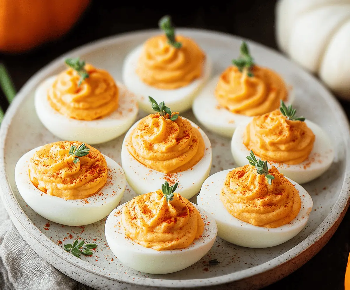 Creamy pumpkin deviled eggs garnished with herbs, perfect for fallsnacks and holiday parties.