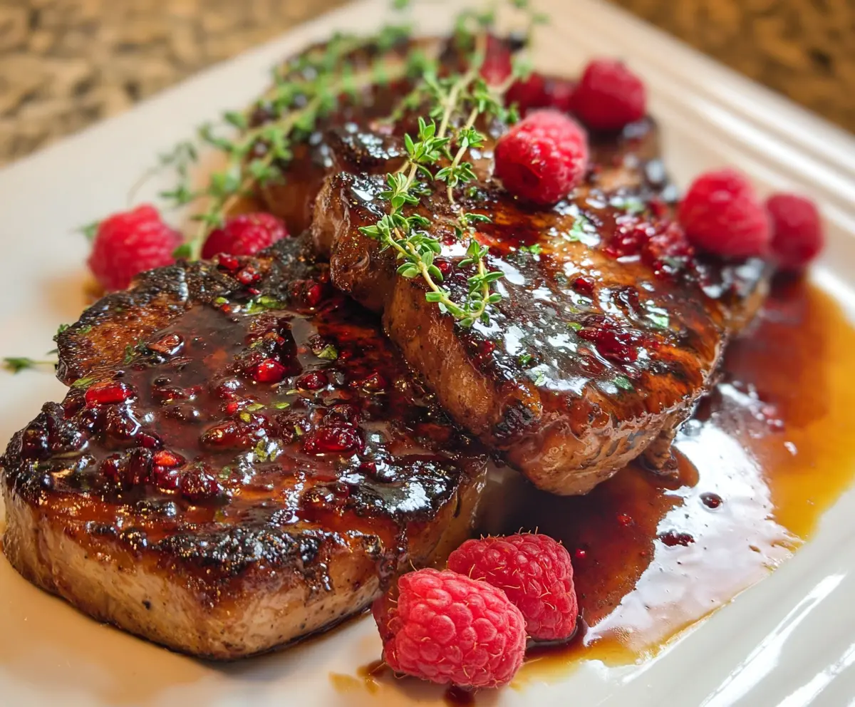 Remove the skillet from the heat and let the pork chops rest for a few minutes. This helps keep them juicy. To plate, place the chops on individual plates, spoon more glaze over the top, and garnish with fresh raspberries, sprigs of thyme or mint, and lemon slices for a pop of color. Serve warm alongside your favorite sides like rice, mashed potatoes, or steamed vegetables.