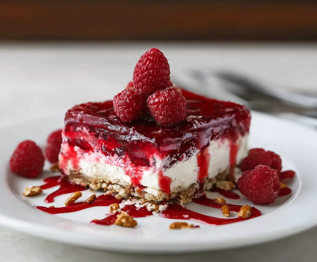 Delicious Raspberry Pretzel Dessert featuring a layered treat with fresh raspberries, pretzels, and creamy topping.