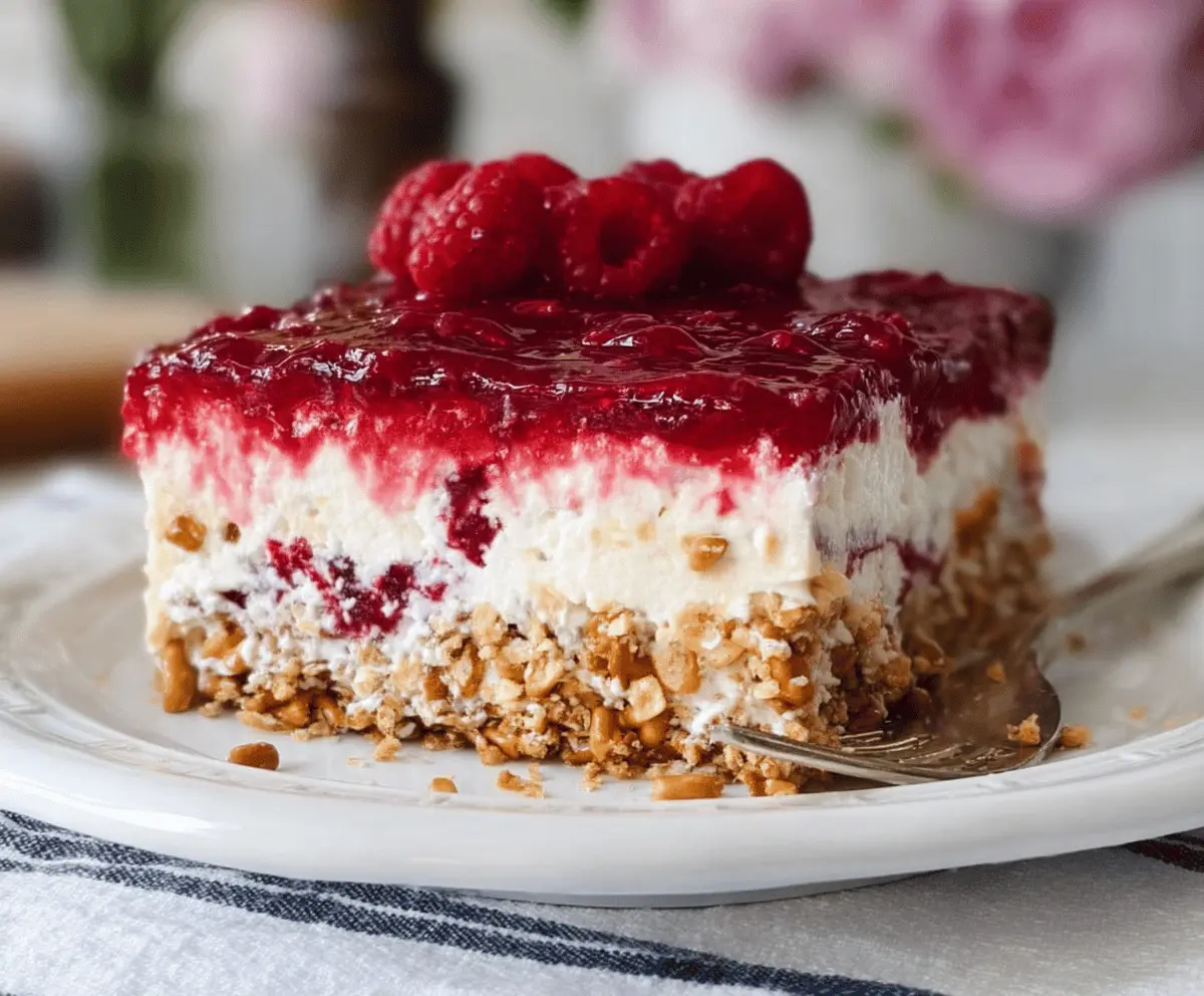 Once set, cut your dessert into squares. Top each piece with additional fresh raspberries for that lovely finishing touch. Serve chilled and enjoy every delicious bite of your Raspberry Pretzel Salad Cake!