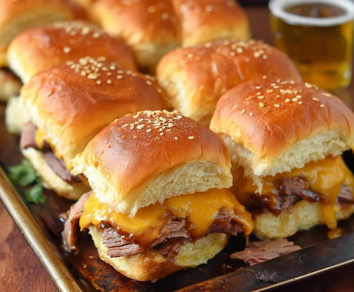 Delicious roast beef and cheddar sliders served on a platter for a savory appetizer.