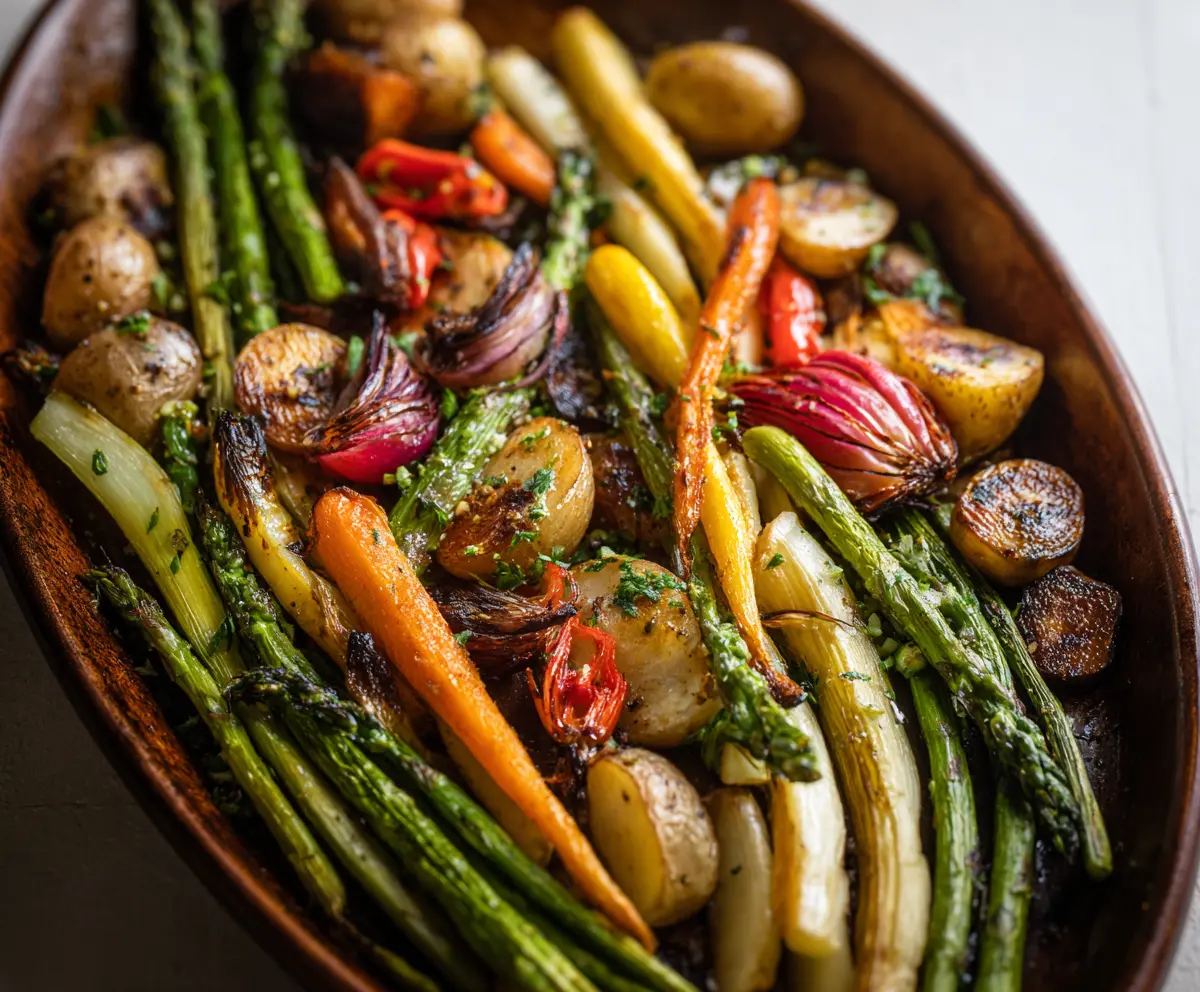 Roasted spring vegetables are a colorful mix of fresh veggies like carrots, asparagus, and bell peppers. Toss them in olive oil, sprinkle with herbs, and they’re ready to shine!