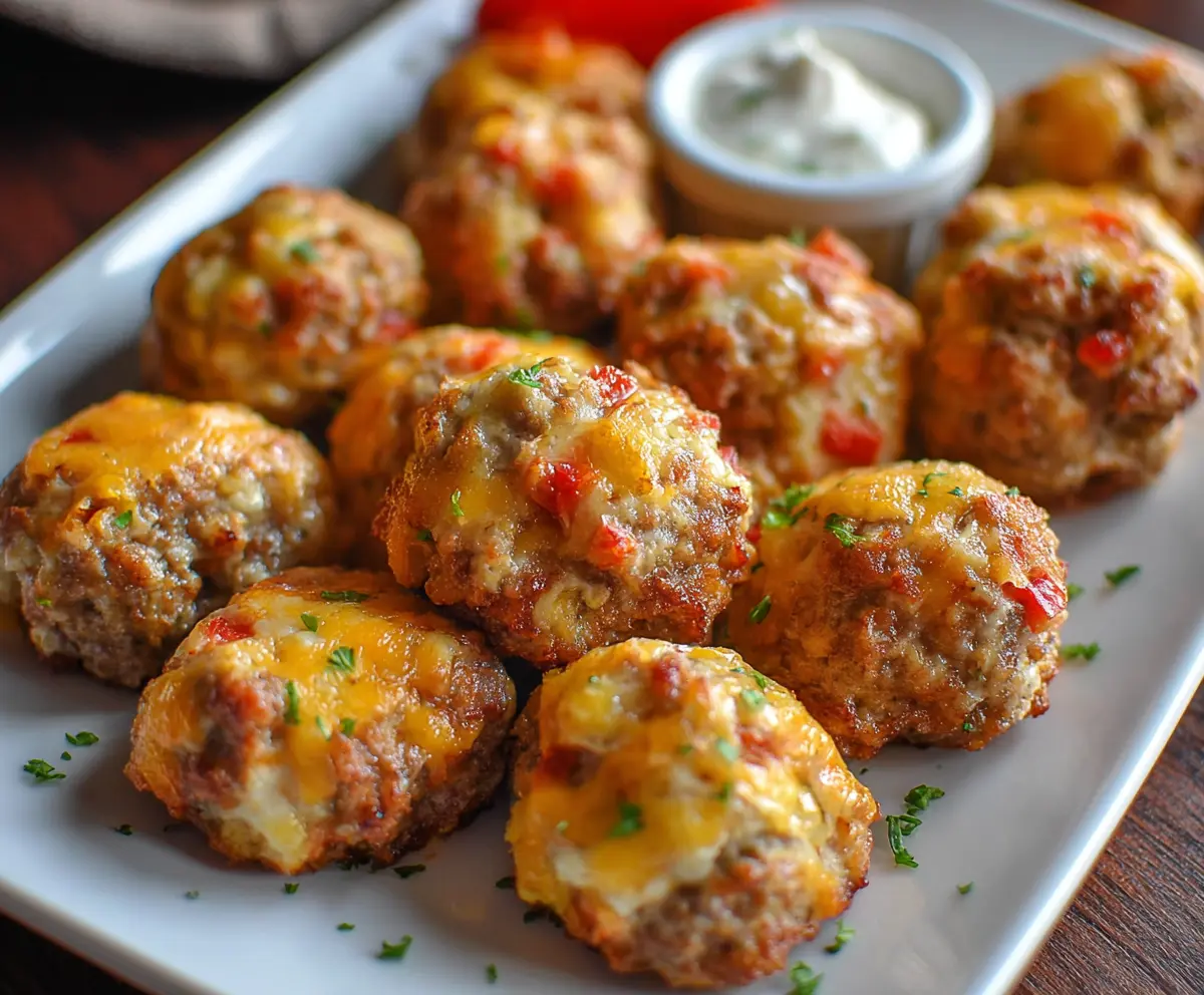 Once they’re out of the oven, let the sausage balls cool for a few minutes. If you’d like, you can garnish them with chopped fresh parsley or chives. Serve them warm with your favorite dipping sauces, like ranch or spicy mustard!