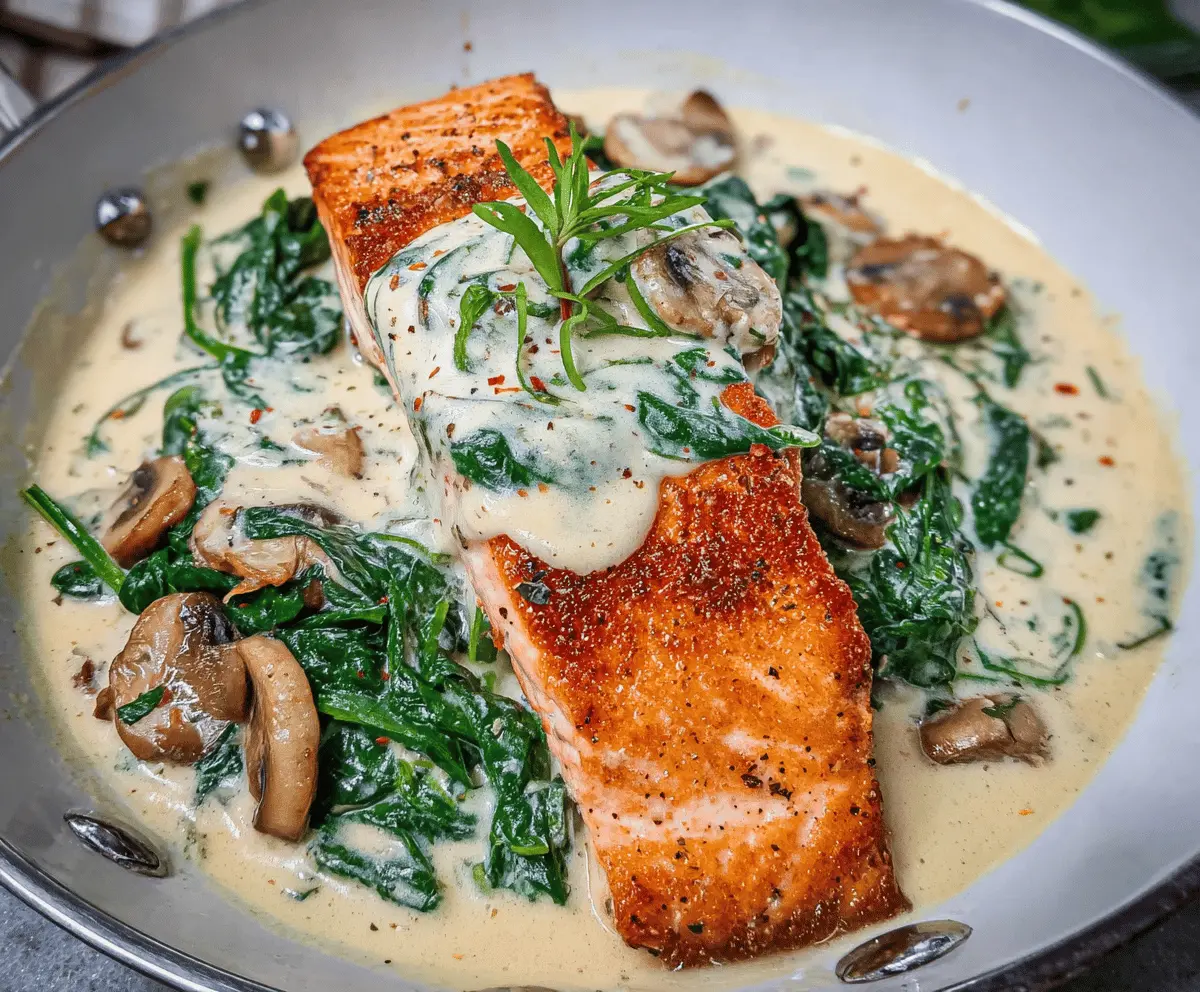 Gently return the cooked salmon to the skillet, nestling it into the creamy spinach sauce. This helps the salmon soak up all the delicious flavors.