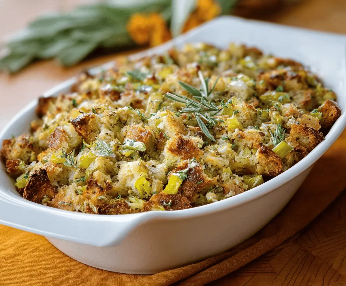 This savory herb stuffing is aromatic and full of fresh flavors from sage, thyme, and rosemary. The tender celery and onion add a wonderful texture. Serve it as a delightful side dish for poultry or any festive meal!