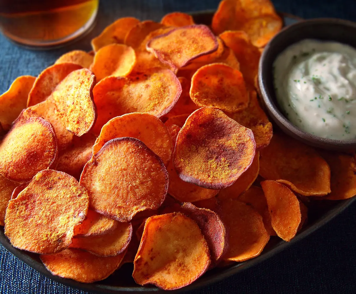 Serve your spicy sweet potato chips immediately, ideally with a cooling dip like herbed yogurt or sour cream. Enjoy your delicious and healthy snack!