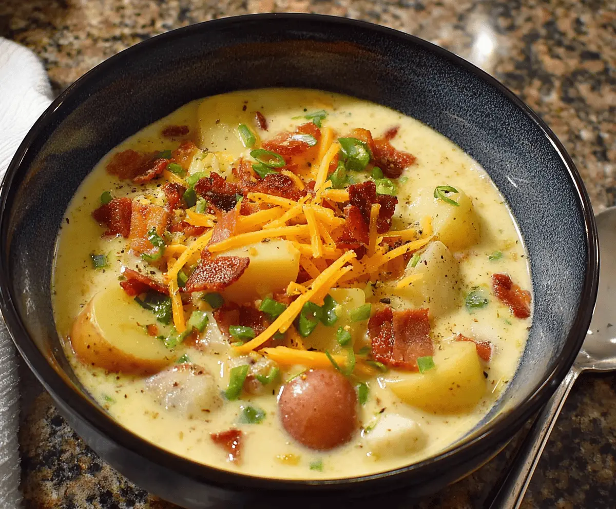 This recipe yields a rich, hearty, and creamy potato soup with tender potatoes, savory bacon bits, and melted cheddar, garnished with a fresh touch of chives. It’s a delightful meal that feels like a warm hug on a cold day! 🥔❤️