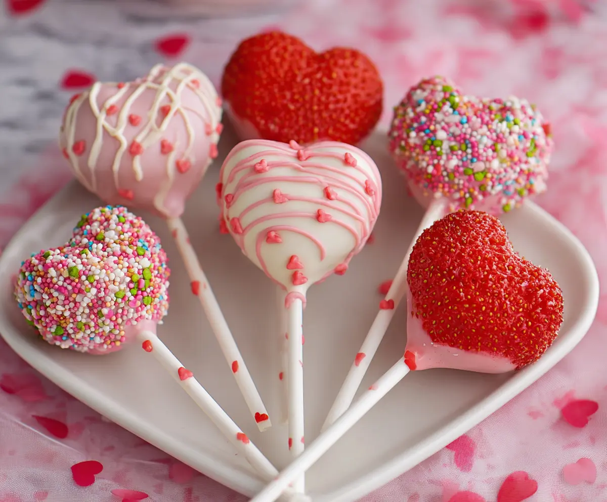 While the coating is still wet, sprinkle on your desired sprinkles (red, white, pink), and place edible heart decorations or fondant heart shapes on each pop. If you’re feeling fancy, drizzle some white melted chocolate across a few of the pops and add tiny pink heart sprinkles for an adorable touch!