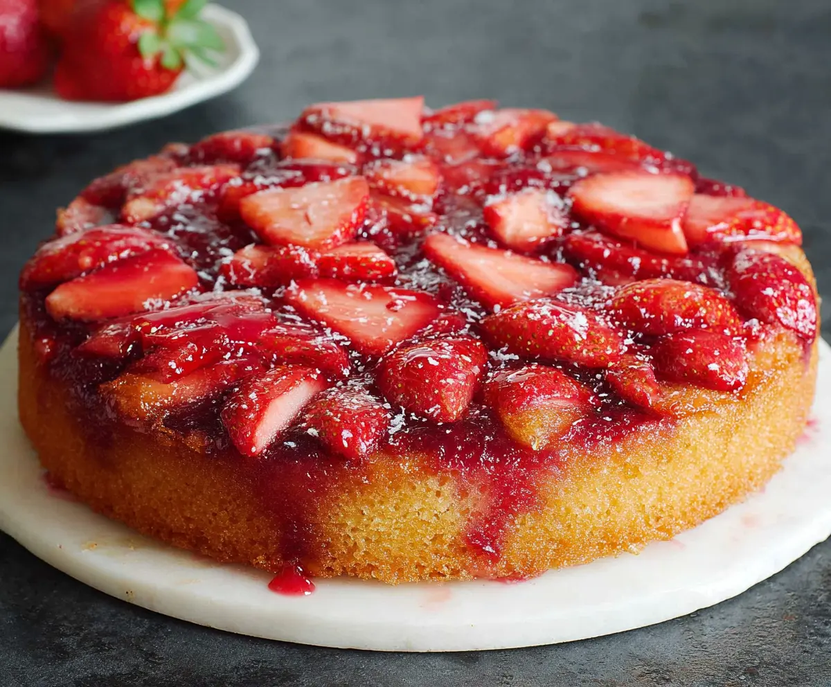 This Strawberry Upside Down Cake features juicy strawberries and a moist vanilla cake. The sweet fruit tops the cake, making it look beautiful and tasty!