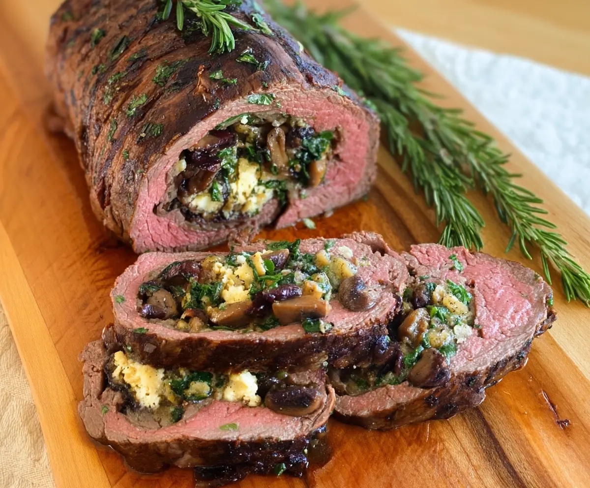 Slice the tenderloin into thick rounds and serve garnished with fresh rosemary sprigs. It’s time to enjoy your delicious homemade stuffed beef tenderloin with your favorite sides!