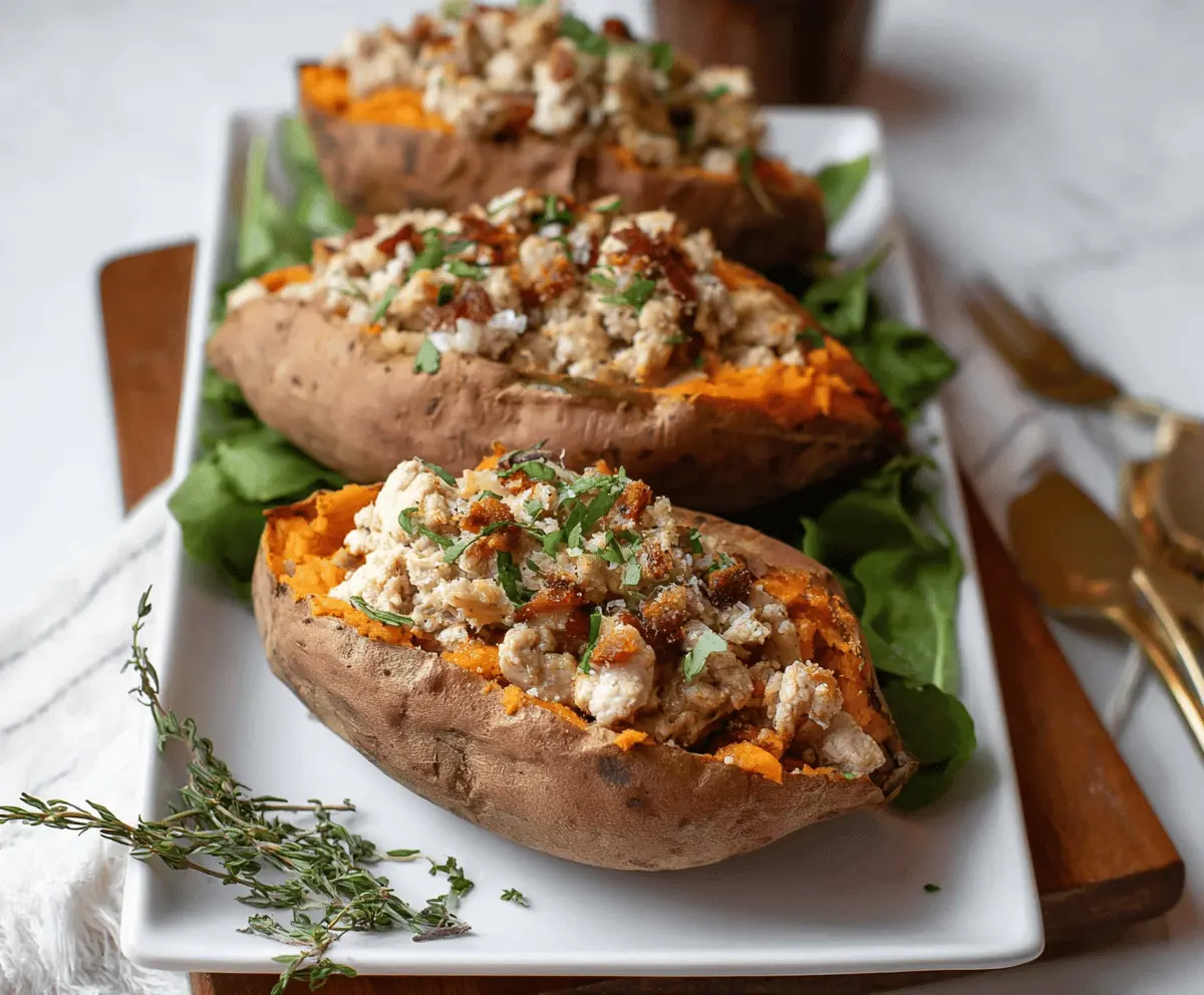 Delicious stuffed sweet potatoes filled with seasoned turkey, topped with fresh herbs and melted cheese, served on a plate