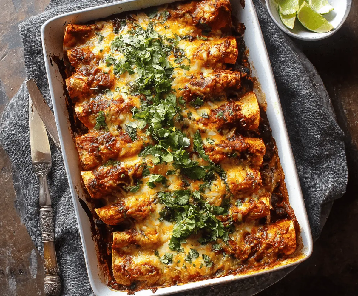Once out of the oven, let the enchiladas cool for a few minutes. Then, garnish with sliced avocado, fresh cilantro, and a dollop of sour cream. Serve with lime wedges on the side for an extra zing!