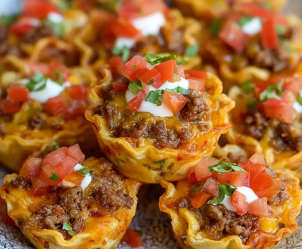 Spoon the taco beef and cheese mixture generously into each wonton cup. Don’t be shy—fill them up! Then, sprinkle the remaining shredded cheeses on top of each one for that cheesy goodness.